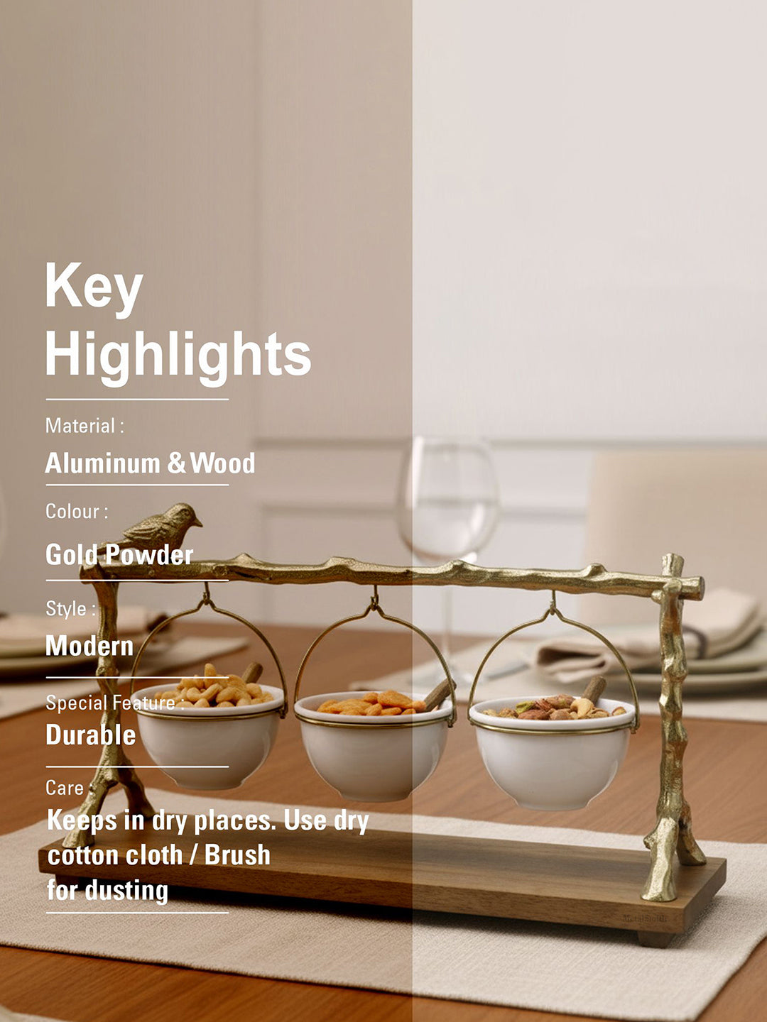 Hanging Mechanism: Each bowl is suspended from the main branch by gold-toned metal hangers or chains, allowing them to swing gently, which adds to the whimsical charm.